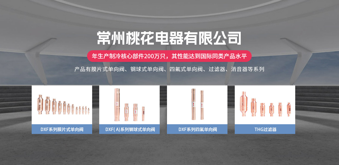 常州桃花電器有限公司地處中國長江“金三角”之稱的上海至南京高速公路、城際高鐵、常州高新經濟技術開發區路段,交通便利、技術力量十分雄厚。它是集研究、開發設計、制造和經營制冷核心部件的企業,主要生產中央空調上使用的制冷部件。產品有膜片式單向閥、鋼球式單向閥、四氟式單向閥、過濾器、消音器等系列。年生產制冷核心部件200萬只,其性能達到國際同類產品水平?! ∑髽I擁有先進的科學技術、國際先進的生產加工設備和精密的檢測儀器,并已通過ISO9001質量體系及CE認證,公司歷史悠久,2000年起,經過長期積累、沉淀,經驗豐富,從而保證了產品的高質量、高性能、高耐用性。企業產品在國內外市場具有較高的知名度,深受眾多中外品牌制冷客商的好評。主要客戶有約克、麥克維爾、美的、開利、特靈、頓漢布什、清華同方、天加等.并出口北美、歐洲、東南亞等地區。 高品質產品是企業的保證,周到服務是合作友誼的承諾,企業本著“求